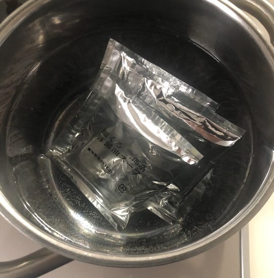 スープは1食分ずつ分けられていますが、冷蔵庫で保管していると脂でカッチコチに固まっていますので湯煎で温めて溶かしておきます。