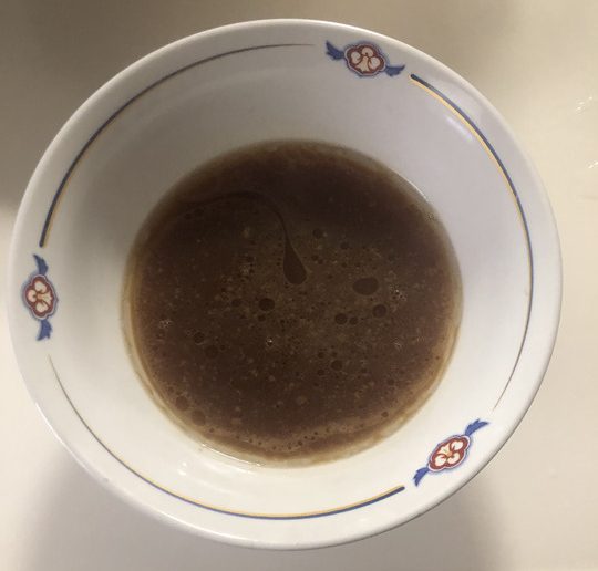 暖かくしたスープの素と湯(300ml)を入れてスープを作ります。濃いめがお好みなら250ml、つけ麺として食べるなら200mlのお湯を足すだけです。とても簡単!